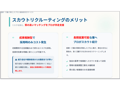 求人広告、人材派遣紹介、スポット採用、ダイレクト採用を熟知した医療・介護に特化した採用のプロが貴社に最適な採用戦略をプロの知見を活かしつつ採用業務代行・伴走いたします。